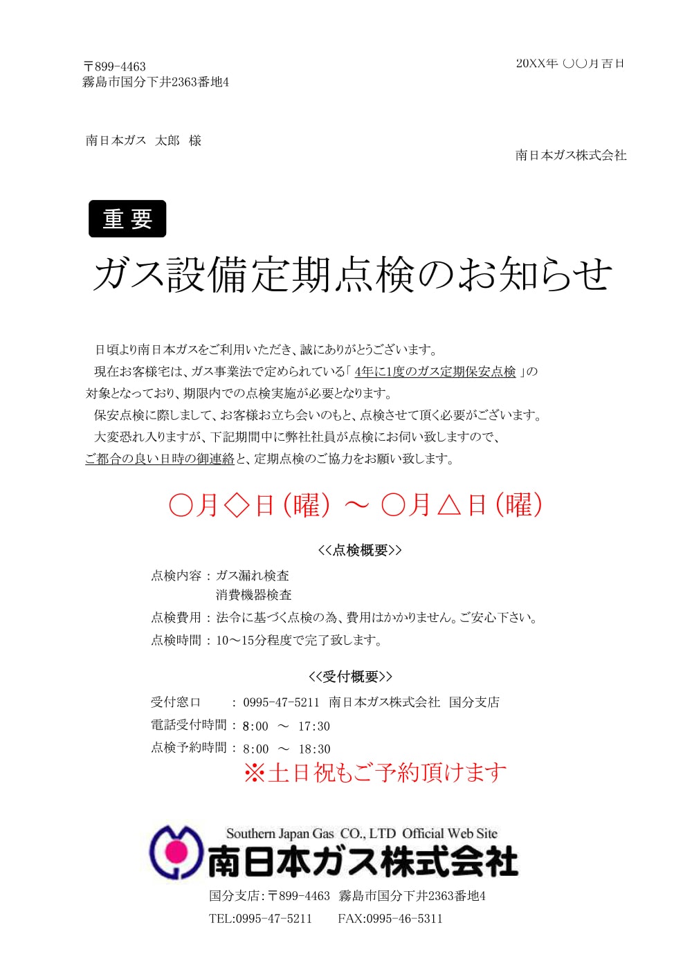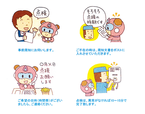 お客様にガスを安心してご使用いただくために、ガス事業法にもとづき4年に1回以上お客様宅を訪問し、ガス漏れ検査やガス機器の検査を行っています。ガスをより安全にお使いいただくために、ご協力お願いします。