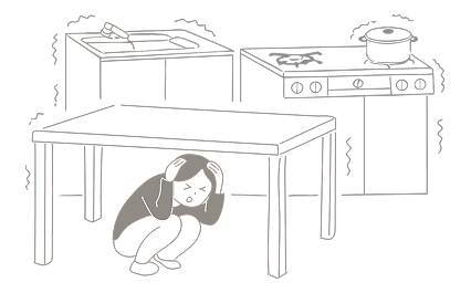 地震のときは、まず身の安全を確保しましょう。揺れが収まってから、ガスの火を消してください。