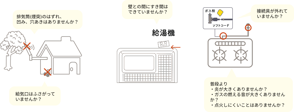 地震や台風などの自然災害のあと、ガスをふたたび使うときには、ガス機器や給排気設備に破損や異常がないかを確認してから使用してください。