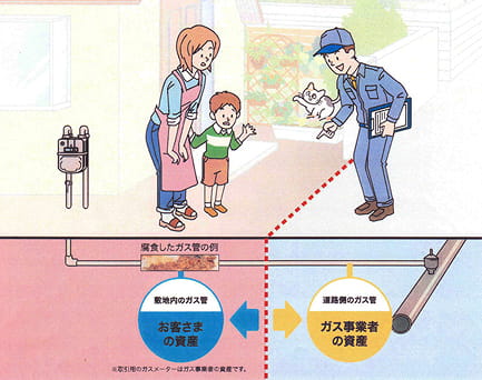 土の中に埋められている白ガス管(亜鉛メッキ鋼管)は、腐食が進行している可能性があります。敷地内のガス管はお客さまの所有物となるため、お早めのお取り替えをおすすめしています。お取り替えは有償にて行わせていただきます。詳しくはガス導管事業者までお問い合わせください。