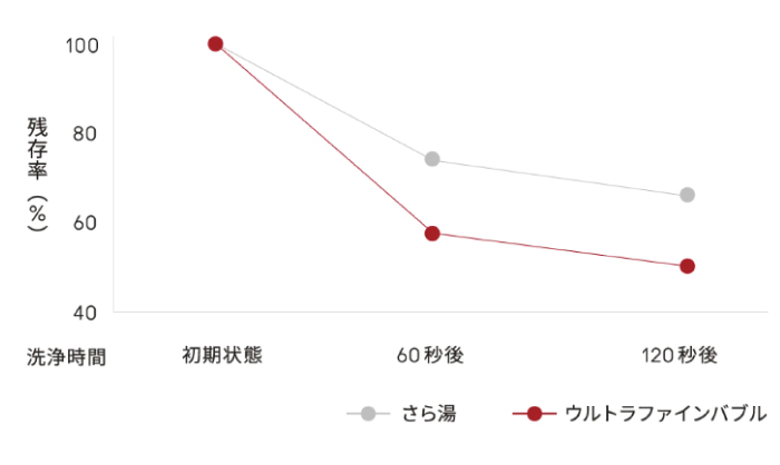 - 微細な気泡が⽪膚の汚れに吸着し取り除きます。⽑⽳に溜まった⽪脂汚れにも気泡が吸着し、かき出すことで肌を清潔に保ちます。実証試験でも通常⼊浴より汚れの除去率が⾼い結果が出ています。