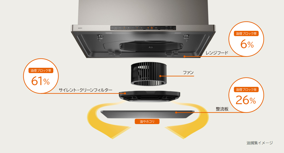 - 油やホコリがファンに届く手前で 約93%ブロック するから、10年間ファンのお手入れが不要。